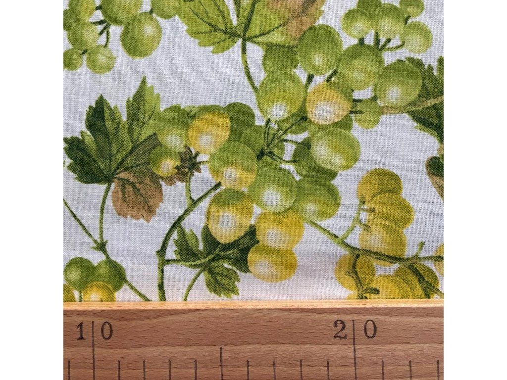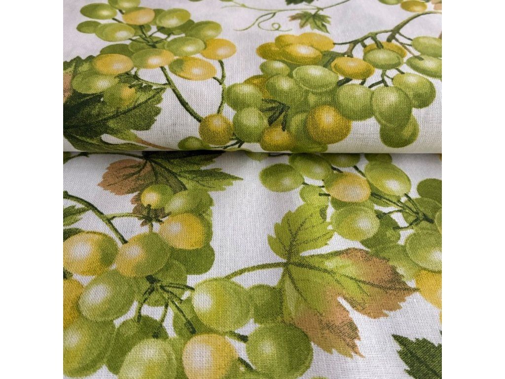 Tato látka s motivem bílého hroznového vína dodá vašim projektům jedinečný šmrnc. Vzor inspirovaný přírodou se skvěle hodí do kuchyně i venkovsky laděného interiéru.