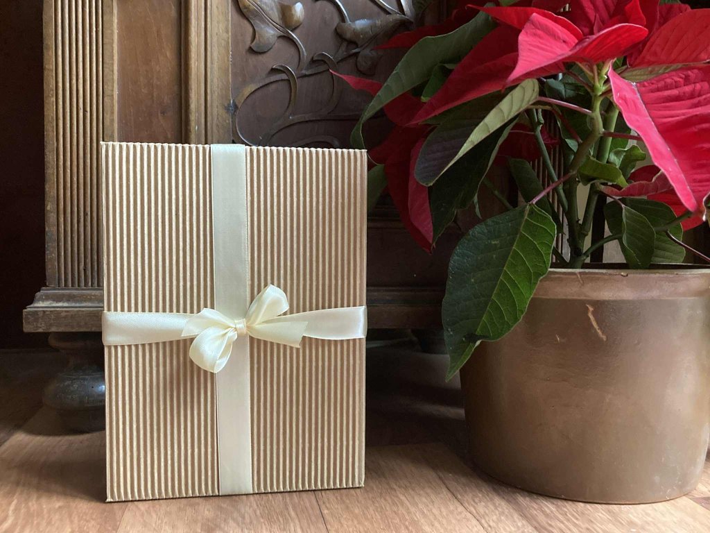 Baleno v krabičce z vlnité lepenky, převázáno stuhou.
