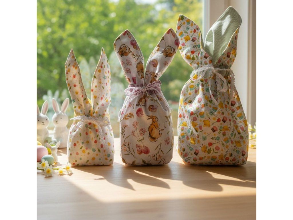 Roztomilá sada velikonočních pytlíčků pro děti ve tvaru zajíčků s oušky je ideální na koledu i velikonoční nadílku. Tyto látkové pytlíčky na velikonoční výslužku si děti zamilují díky jejich hravému designu a jemným jarním motivům.